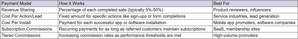 Affiliate compensation has evolved beyond simple percentage-of-sale structures. Today’s affiliates can choose from multiple payment models depending on their content style and audience :